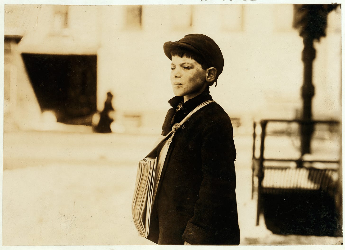 În încheierea acestui articol, câteva crâmpeie de știri despre unde, cum și cu cine a început vânzarea stradală de ziare în afara chioșcurilor. Cel mai probabil, în America secolului al XVIII-lea, unde un viitor părinte fondator al SUA, Benjamin Franklin, al 15-lea dintre cei 17 copii ai unei familii din Boston, avea să fie socotit „primul vânzător de ziare american” după ce, la 15 ani, în 1721, a livrat săptămânalul „New England Courant” al unuia dintre frații săi, la tipografia căruia a lucrat de la 12 ani. Nașterea propriu-zisă a îndeletnicirii de vânzător ambulant de ziare în America a avut loc, de bună seamă, la 1833, când alt Benjamin, Benjamin Day, editorul publicației bombastice „New York Sun”, care nu se vindea în magazine sau sub formă de abonament, a dat un anunț de angajare pentru șomeri. Spre surprinderea sa, anunțul n-a atras adulți, ci copii. Aceștia au devenit vânzători ambulanți de ziare pe străzile New York-ului, într-o vreme în care, obicei ce avea să se perpetueze de-a lungul secolelor, vânzătorii de ziare nu erau angajați ai ziarelor, luându-le de la angrosiști în pachete de 100 și comercializându-se ca agenți de vânzări independenți, stând pe drumuri și strigând „Extra, extra!” de dimineață până seara, neputând returna tirajul nevândut și câștigând în jur de 30 de cenți pe zi (ceea ce în 2024 avea să fie echivalentul a 11 dolari). Vestitorii știrilor altora erau porecliți newspaper hawker, newsboy sau newsie și se deosebeau de cei care îmbrățișau îndeletnicirea de news butcher, ca Thomas Edison sau Walt Disney, prin faptul că aceștia din urmă vindeau ziarele în trenuri, pe lângă acadele și țigări. Rândurile acelor copii aveau să fie îngroșate de micul Tony Casale, zis Bologna, surprins în acțiune de fotograful Lewis Hine la 1909, în Hartford, Connecticut (foto Wikimedia Commons). Iar drumul acestui minor cu o expresie facială la fel de chinuită ca bretonul său fusese deschis de primul care a răspuns la anunțul lui Benjamin Day, Bernard Flaherty - pui de irlandez ajuns în America - în vârstă de 10 ani, viitor comediant, care interpreta în mod creativ conținutul ziarelor distribuite deși nu era ziarist, țipând cât îl țineau bojocii „Ticăloșie dublu distilată”; „Efectele blestemate ale beției!”; „Întâmplare oribilă!”; „Afacere infamă!”.