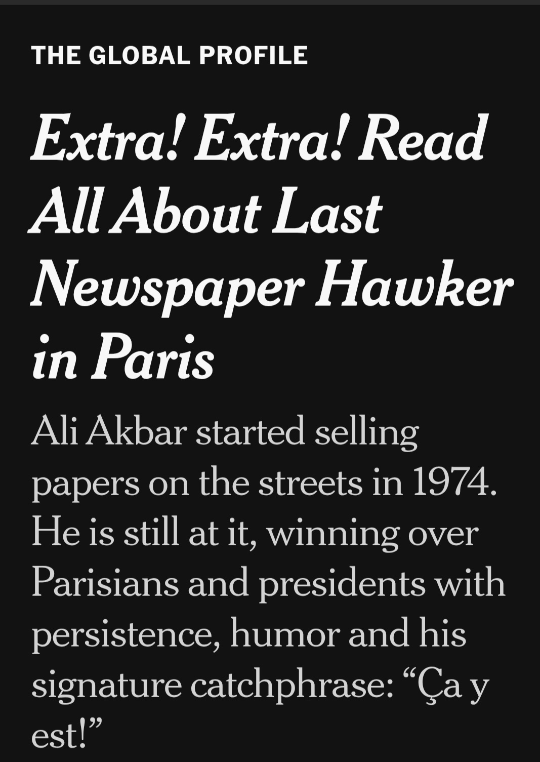 Și publică Roger Cohen, în iulie 2025: „Printre cafenelele literare și buticurile șic din cartierul St.-Germain-des-Prés din Paris, un bărbat poznaș cu un teanc de ziare își face turul, strigătul său caracteristic „Ça y est!” sau „Asta este!” răsunând pe străzile înguste și pietruite. Ali Akbar din Rawalpindi, Pakistan, este un bărbat cu un zâmbet gata, care vinde ziare de o jumătate de secol. Uneori, își condimentează ofertele cu povești inventate. „Ça y est! Războiul s-a terminat, Putin cere iertare!” a fost o afirmație recentă care a stârnit o ilaritate sumbră. De la Café de Flore la Brasserie Lipp, două localuri celebre unde se împletesc mâncarea și cultura, domnul Akbar practică o meserie pe cale de dispariție, o marfă în scădere. Este considerat ultimul vânzător ambulant de ziare din Franța”.