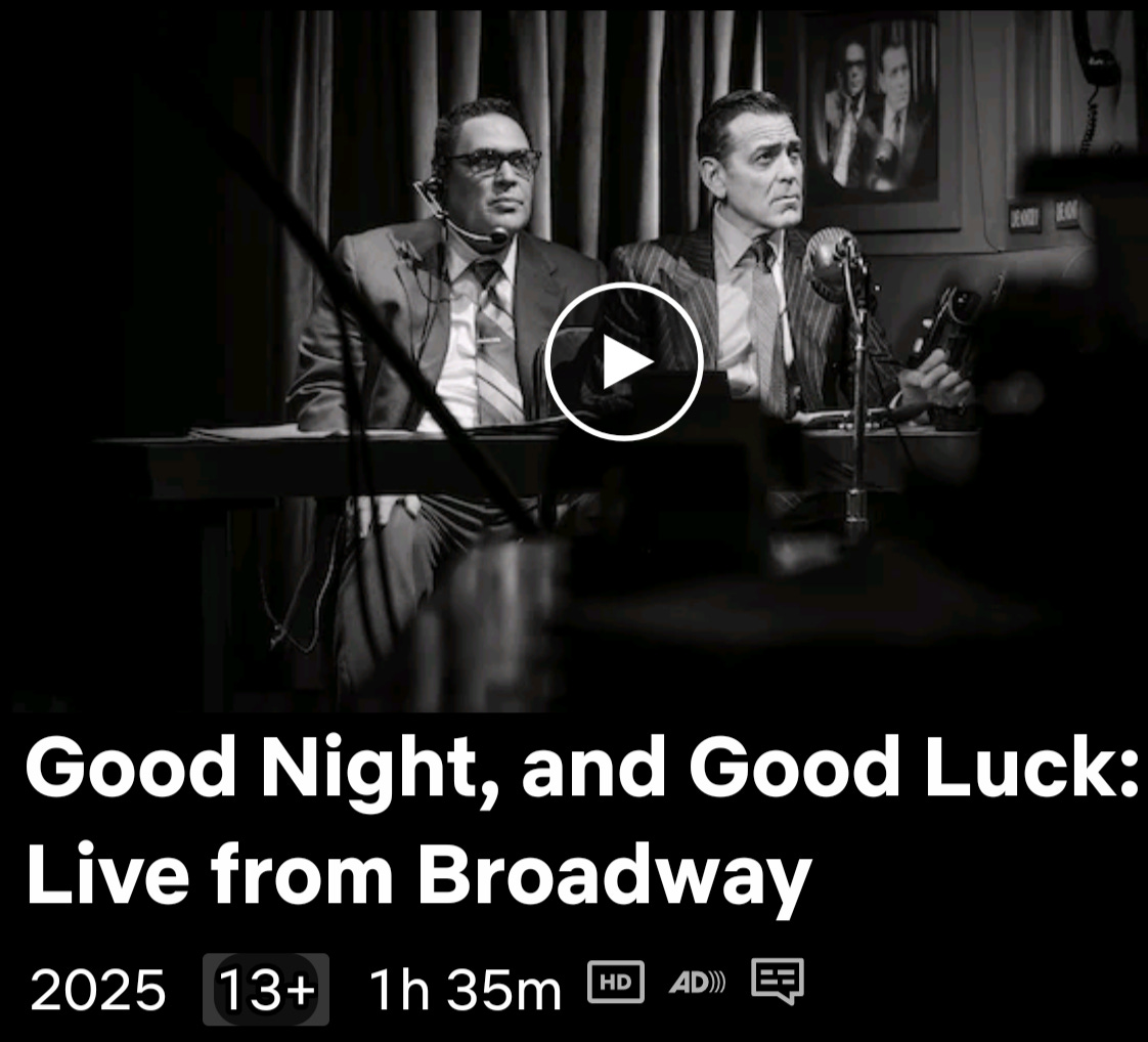 Un eveniment cultural major al începutului de an: de pe 7 ianuarie, cea mai profitabilă piesă din istoria Broadway-ului și prima care a depășit încasări de patru milioane de dolari într-o singură săptămână poate fi urmărită pe Netflix. Nu stric nicio supriză - subiectul nu mai e printre noi din 1965, așa că prezint povestea de la începutul cronicii, oricum, cei interesați o știu deja: piesa „Good Night, And Good Luck”, scrisă de George Clooney și de Grant Heslov, reflectă povestea marcantului om de știri Edward R. Murrow, care a stabilit o ștachetă greu de atins în jurnalism, în calitate de corespondent de război (reporter radio) și, ulterior, ca prezentator al emisiunii TV de știri „See It Now” tot din rețeaua CBS. El a probat cu asupra de măsură curaj, demnitate și devoțiune față de valorile imuabile ale presei sfidându-l pe senatorul Joe McCarthy din Wisconsin, care declanșase - culmea, prin mijloace tipic comuniste - o devastatoare vânătoare de vrăjitoare ce a polarizat și încrâncenat America.