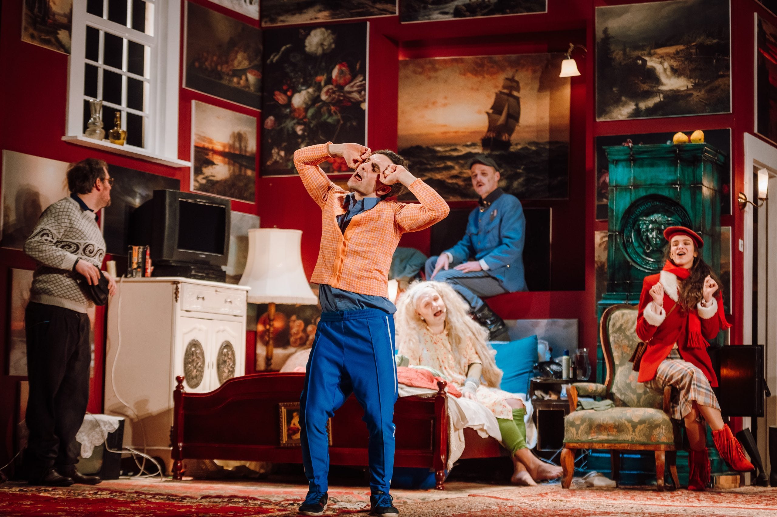 Sunt conștient că e nedrept să fac o evidențiere, nu doar din sânul acestui colectiv provincial ce-și merită pe deplin atributul național din titulatura teatrului, ci și în contextul travestiurilor recurente din universul teatral afrimian. Am văzut multe, toate grozave. Al lui Csaba László - laureat anul trecut pentru joc actoricesc remarcabil de către Ministerul Culturii și Inovării din Ungaria și de către UNITER acum trei ani, Cel mai bun actor în rol secundar, în „Grand Hotel Pasărea Retro” - atinge desăvârșirea. În tonul pe care actorul îl împrumută personajului său feminin, nu cunosc unul mai puternic în literatura română despre maghiarii din Ardeal, am regăsit toată trufia pe care am întâlnit-o în copilărie la personaje reale, întreg disprețul lor față de prezent și viitorime, față de conaționali și față de alte naționalități. În vorbele concepute de Radu Afrim și rostite cu limbă despicată, de unguroaică, de către actorul maghiar din România am detectat complexul de superioritate al șoricelului unguresc din Ardeal care trăiește cu iluzia că a tropăit alături de elefantul imperiului austro-ungar. Discursul găunos carolingian al personajului Both Karola, de fapt, toate modalitățile sale de expresie net mai bogate decât o singură trăsătură negativă a unei bătrâne decrepite dintr-o casă înaltă cât un bloc, mi-a prilejuit reîntâlnirea cu oameni reali și poveștile lor adevărate din Ardealul meu de suflet, oameni care nu mai sunt, dar rămân în memoria mea afectivă: adoratele mele rude din filiația maternă; artista care „picta” asamblând în rame petice textile cu pasta de lipit socialistă Pelicanol - aparent, bună de gustat cu lopățica - pe care am vizitat-o în locuința-atelier înainte să plece în America, mergând cu mama și cu prietena ei, tanti Aurica zisă Aranka de pe Lupeni 12, ciudata care și-a îngropat trei bărbați și i-a strămutat în virtutea unui aproape cinstit comerț cu oseminte, transportate profund ilegal în sacoșe de plastic; Molnár néni, băbuța din vecini, care vindea semințe de dovleac în cornete din ziare, după o viață în care a slugărit la Budapesta, a băut până la 80 de ani și s-a lăsat brusc după ce-și vânduse și ultimele prosoape; Bözsi néni, care stătuse înainte în acea cameră pe post de apartament, se mutase apoi în altă curte, îi mai procura bunicii câte ceva pe sub mână și părea că are undeva în casă o lumânare ce arde veșnic, căci o vizitam și-mi cerea mereu foc, în timp ce fuma țigară de la țigară până când i se subțiaseră obrajii, făcând pliuri ca un Sharpei; familia Dombrádi, soț și soție, participanți la competiția duminicală de consumat găluște cu prune în curtea patriarhală de pe Târgului 12 unde mai toți bărbații fuseseră funcționari la poștă și mai toate femeile casnice, cărora le citeam subtitrarea românească din filmele de la televizor într-o limbă pe care o înțelegeau puțin spre deloc, dar care ne primeau fiindcă aveau un TV - acolo am văzut-o pe Nadia, la Montreal, în 1976; Lacika, tânărul leit Errol Flynn, inclusiv la mustăcioară, și cu încălțăminte de lac în care te oglindeai fără efort, pe vremea în care abia aflasem că pantofii unui bărbat sunt expresia devoțiunii partenerei de viață, cât sunt de îngrijiți, atât e și ea de gospodină. Acest imagini mi-au revenit cu putere în minte, unde le voi păstra cât voi putea - ca și apariția imperială a actriței Szabó Fruzsina în chip de Sissi, așa cum îmi va persista în urechi și maghiara secuiască nativă a tinerei originare din Sfântu Gheorghe, căci sună cum se exprima o parte din familia mea.